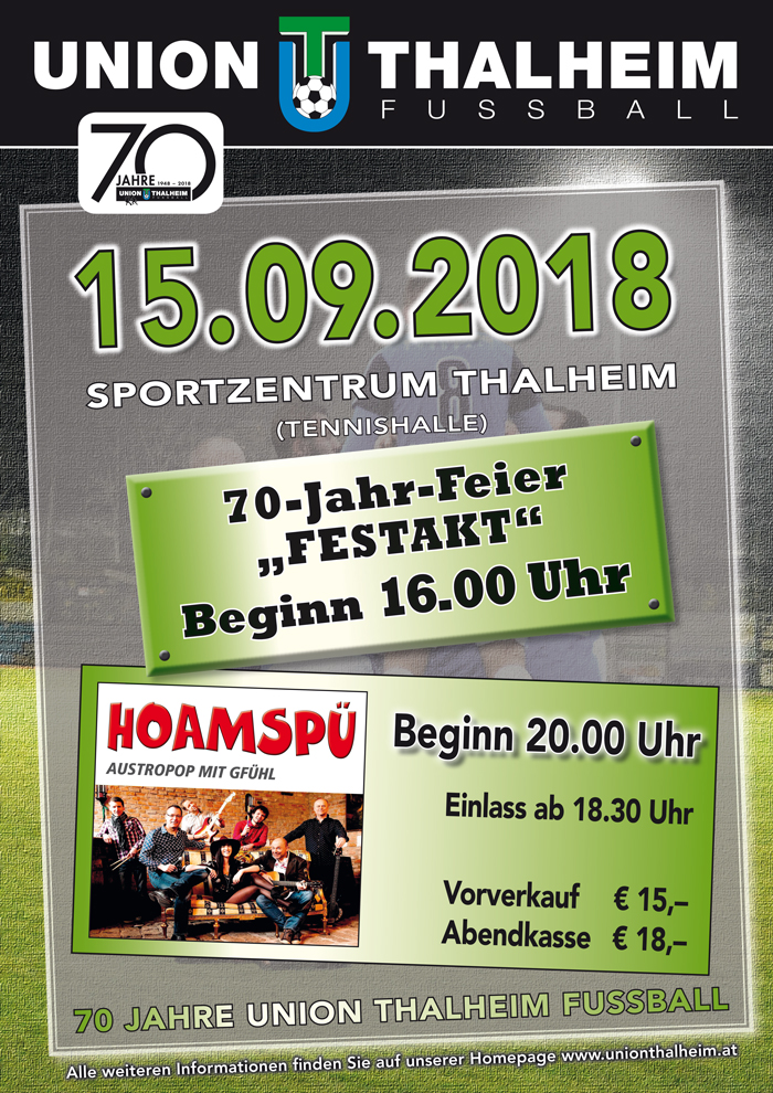Am Sonntag den 15.09.2018 feierte die Union Thalheim Sektion Fußball ihr 70-jähriges Bestehen im großen Stil. Die Feierlichkeiten, die in der zu einer Festhalle umgestalteten Tennishalle der Marktgemeinde Thalheim abgehalten wurden, begannen am Nachmittag mit dem offiziellen Festakt. Das Moderatorenteam, bestehend aus Christof Steinkogler und Marc Oelschlägel, führten durch ein abwechslungsreiches Programm. Zuerst wurde von der aktuellen Vereinsführung auf die Geschichte des Vereins und die Pläne für die Zukunft eingegangen. Anschließend kamen einige der zahlreich vertretenen Ehrengäste aus Lokal- und Landespolitik sowie dem Sport ans Wort und richteten ihre Glückwünsche zum 70-jährigen Jubiläum aus.