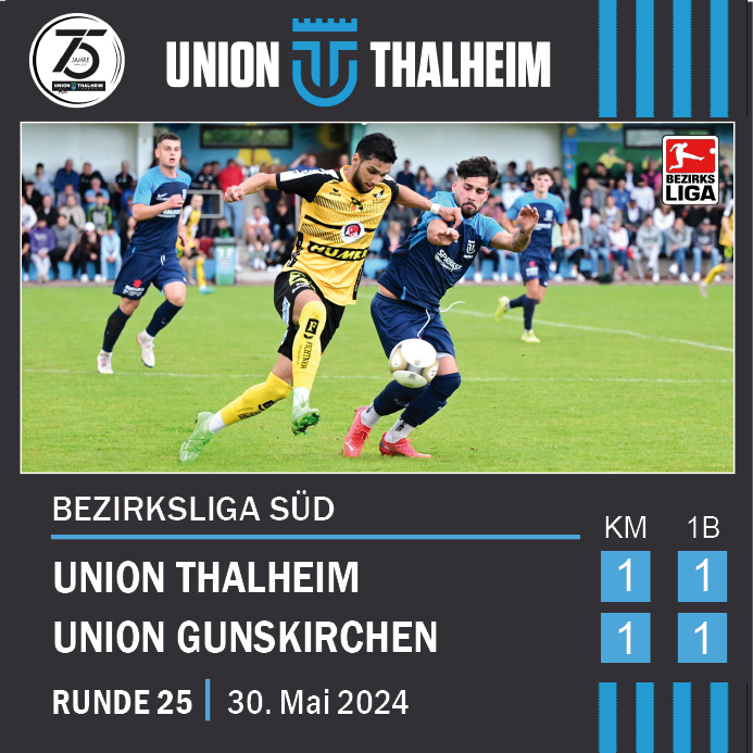 Auch im Derby gegen die Union Gunskirchen erkämpften die Thalheimer ein starkes 1:1 Unentschieden. Die Gäste, die noch gegen Neuhofen um den Meistertitel kämpfen, konnten sich gegen die Haslgruber-Elf also ebenso wenig durchsetzen wie die Neuhofner eine Woche zuvor. Auch das Match der 1b Mannschaften endete mit einem 1:1.