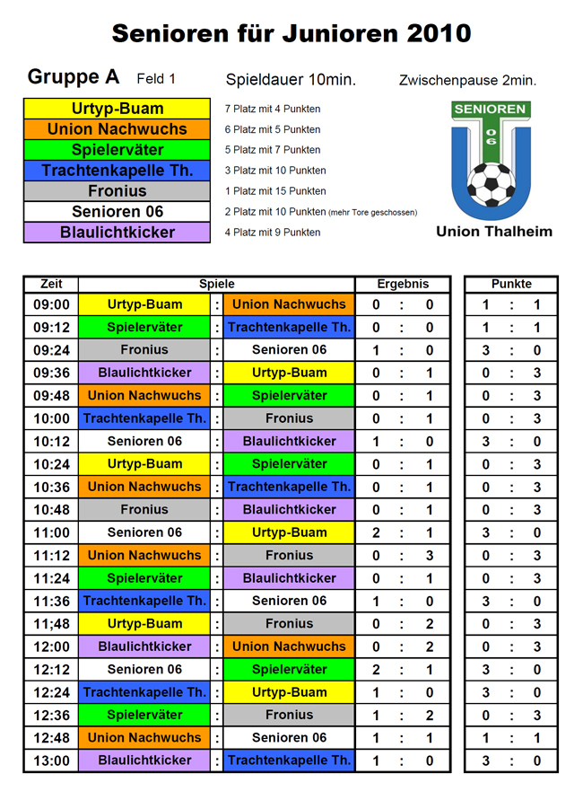Aber nicht nur sportlich war das Turnier ein großer Erfolg, sonder auch kulinarisch. Besonderer Dank gilt hier den Spielerfrauen der Senioren 06, die ein Salat- und Kuchenbuffet zauberten das seinesgleichen sucht. Auch den vielen Helfern, ohne die so ein Turnier nicht funktionieren würde , sagen wir auf diesem Wege ein herzliches Dankeschön. Extra hervorheben möchten wir dabei Klaus Steiner und Wolferl Schuster, die stundenlang hinterm Grill standen und so mit ihren gegrillten Köstlichkeiten auch einen wesentlichen Anteil am finanziellen Erfolg hatten. Herzlichen Dank auch an die Sponsoren wie FMT, Fahrschule Oliver, Weingartner, Azzuro und an Fußball Präsident Dr. Walter Holme, der wie auch im letzten Jahr, ein 50l Faß für den guten Zweck spendete. Wir die Senioren 06 hoffen, dass dieses Turnier auch im nächsten Jahr stattfindet und zu einer festen Einrichtung wird. Der Reinerlös des Turniers wird wie letztes Jahr zu 100% in die mittlerweile über 100 Jugendfußballer und somit in die sportliche Zukunft der Union Thalheim investiert. Auf ein hoffentlich zahlreiches Wiedersehen beim Turnier 2011