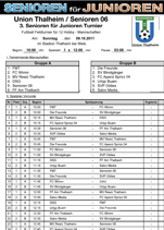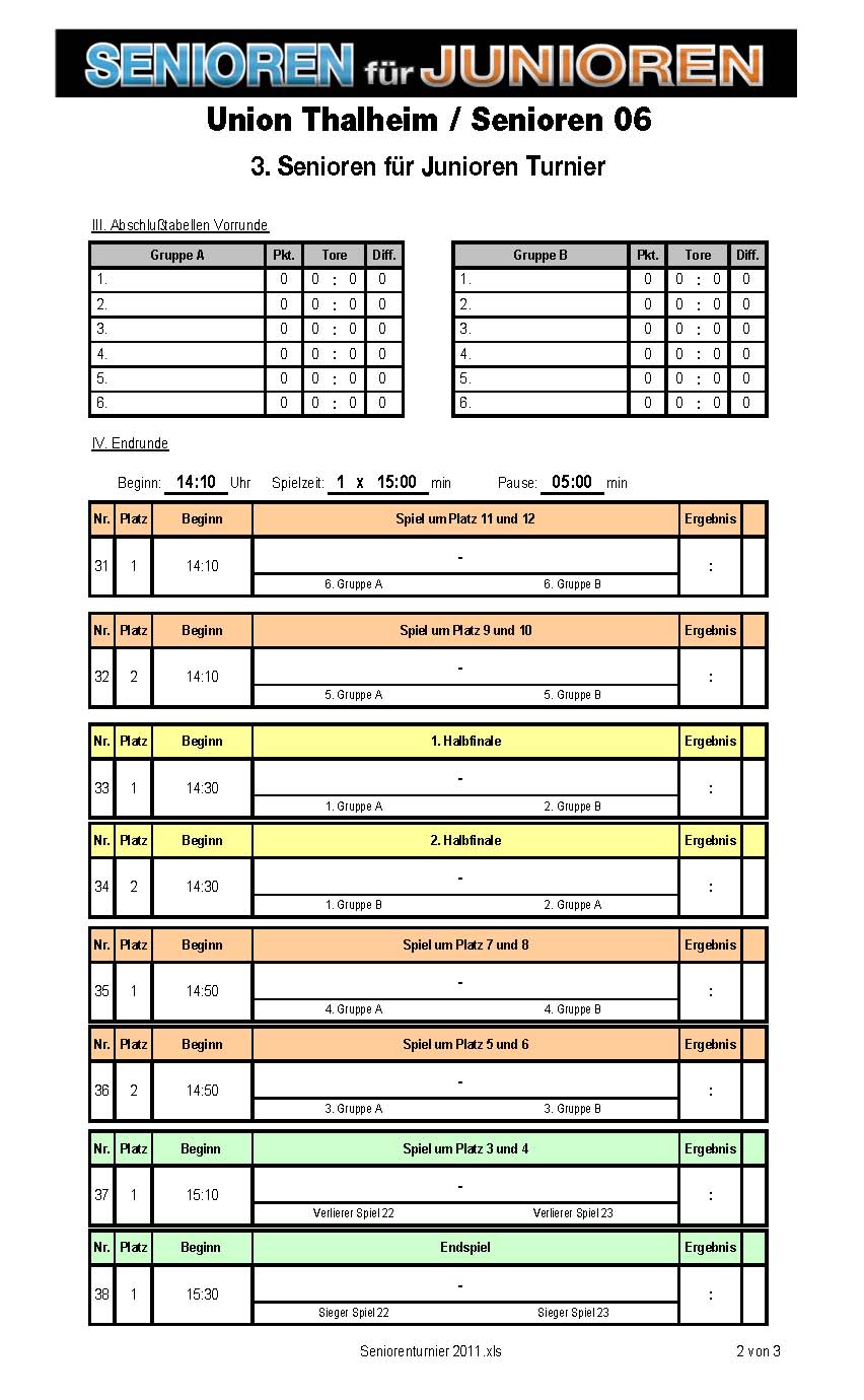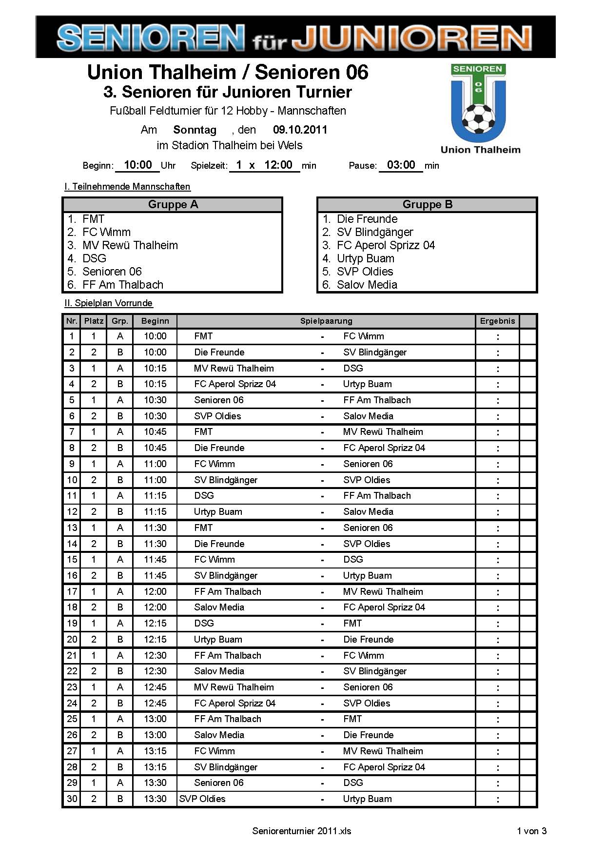 Pünktlich am 05.10.2011 um 19:30Uhr fand im Sportheim die Auslosung für das Turnier statt. Trotz der schlechten Wettervorhersage haben sich insgesamt 12 Mannschaften zum 3. SENIOREN für JUNIOREN Kleinfeldturnier angemeldet. Sollte es am Sonntag regnen oder die Platzverhältnisse nicht zu lassen werden wir das Turnier absagen müssen. Wenn ihr euch nicht sicher seid, ob gespielt wird oder nicht, könnt ihr Thomas Waage am Sonntag ab 09:00 Uhr unter der Telefonnummer 0676 5124109 anrufen. Im Downloadbereich (siehe unten) könnt ihr euch den Turnierplan schon ausdrucken. Auf euer Kommen freuen sich die Senioren 06.
