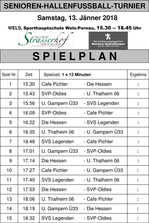Leider stand das Hallenturnier in der schönen Marchtrenker Halle unter keinem guten Stern. Bereits durch viele krankheits,-verletzungs und arbeitsbedingter Ausfälle (Dragan, Waage, Werner, Shaban, Illi usw. ) konnte nur eine Rumpftruppe der Senioren verstärkt durch Torwartlegende Oeli und U16 Meistertrainer Esad den Weg nach Marchtrenk antreten.