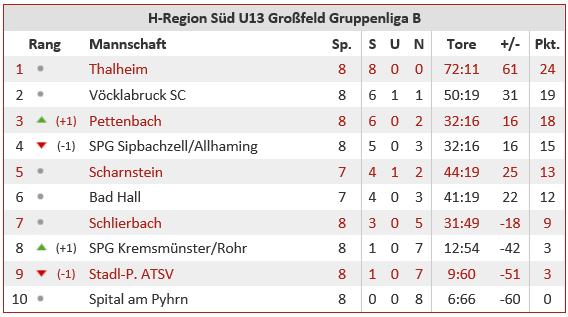 Unsere U13 ist in der Herbstmeisterschaft der Region Süd Großfeld Gruppenliga bislang ungeschlagen und holte sich am 20. Oktober 2019 mit einem klaren 7:1 Heimsieg gegen Bad-Hall bereits frühzeitig den Meistertitel.